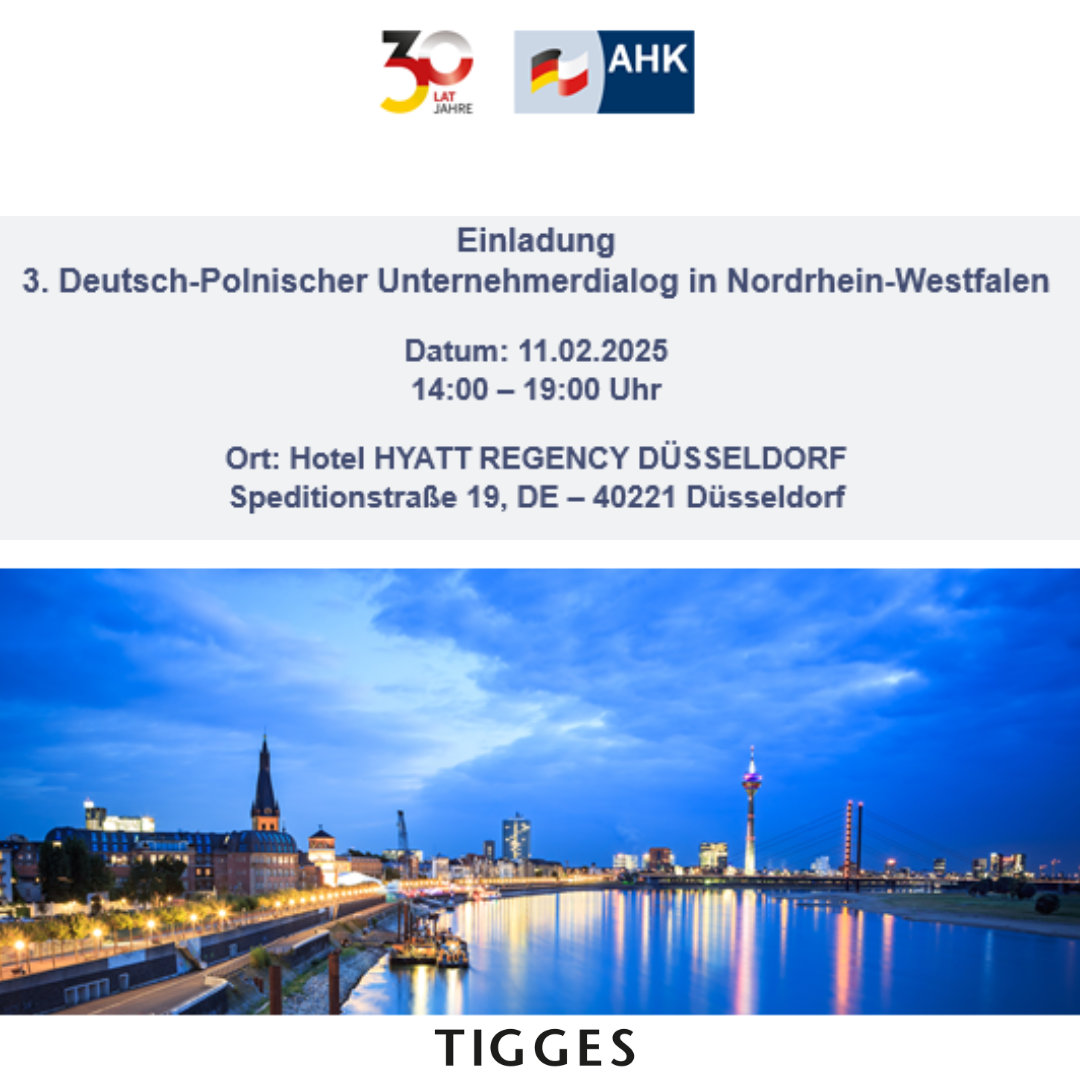 Diese Entwicklungen bieten polnischen und deutschen Partnern umfangreiche Möglichkeiten für neue Geschäftsbeziehungen. Doch Unternehmen fragen sich: Was muss ich beachten? Was sind konkrete Chancen und Risiken? Wie sieht die Situation in den Branchen Defence und Energiespeicher in Deutschland und Polen aus? Diesen Fragen widmet sich der 3. Deutsch-Polnische Unternehmerdialog in Nordrhein-Westfalen, zu dem Sie die Deutsch-Polnische Industrie- und Handelskammer (AHK Polen) in Kooperation mit den Industrie- und Handelskammern in Nordrhein-Westfalen (IHK NRW e.V.), NRW.GLOBAL BUSINESS, der Landeshauptstadt Düsseldorf und dem Generalkonsulat der Republik Polen in Köln herzlich