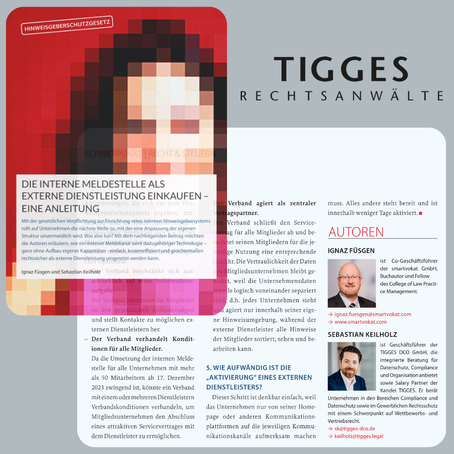 In unserem neuesten Artikel für den "Verbände Report" (Deutsches Verbände Forum - verbaende.com) Ausgabe 05/2023 durften Ignaz Fuesgen, Co-Geschäftsführer unseres Kooperationspartners smartvokat, und Sebastian Keilholz, LL.M., Geschäftsführer TIGGES DCO, beschreiben, wie ein interner Meldekanal als externe Dienstleistung unkompliziert, kosteneffizient und rechtssicher umsetzbar ist: