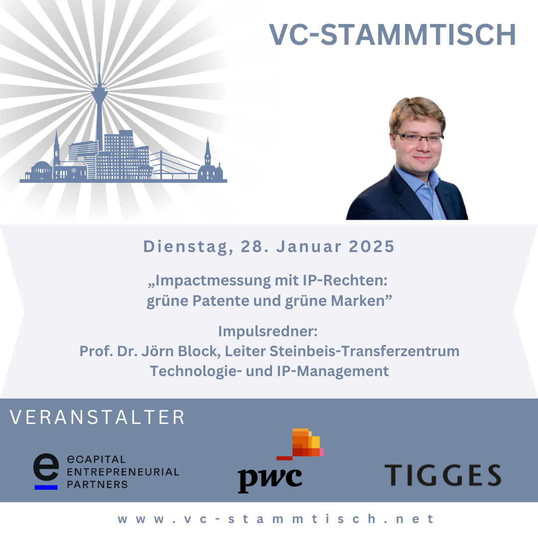 Wir freuen uns sehr darauf, Prof. Dr. Jörn Block (Leiter Steinbeis-Transferzentrum Technologie- und IP-Management) als Impulsredner zum Thema „Impactmessung mit IP-Rechten: grüne Patente und grüne Marken" begrüßen zu dürfen.