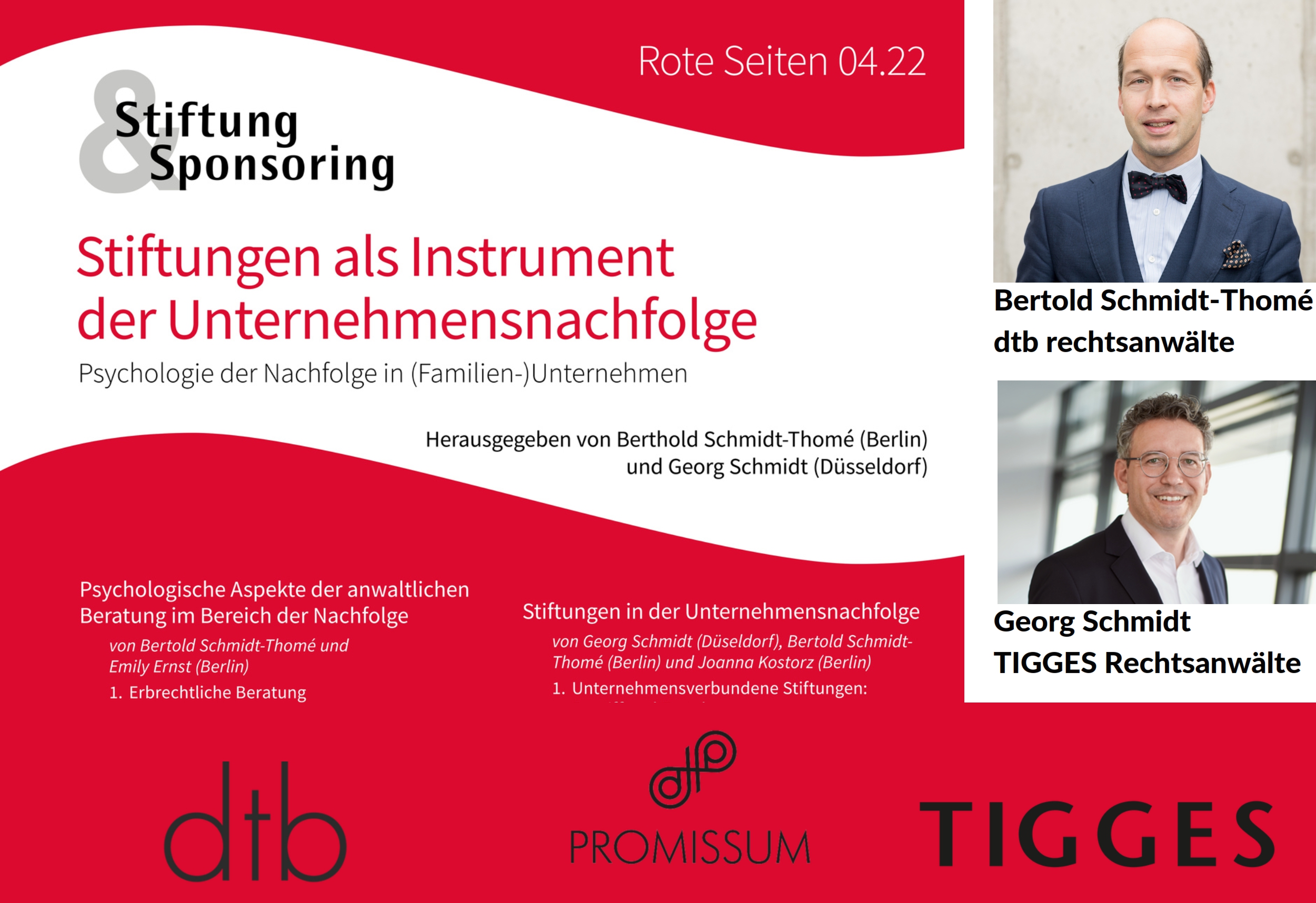 Im Rahmen dieser Kooperation haben wir gemeinsam eine Ausgabe der Zeitschrift „Stiftung & Sponsoring" (Rote Seiten) zu den Themen Psychologie des Erbens und Stiftungen als Instrument der Unternehmensnachfolge gestaltet. Bertold Schmidt-Thomé von dtb rechtsanwälte und Georg Schmidt von TIGGES Rechtsanwälte beleuchten in dem Heft unter anderem die Möglichkeiten, die eine Stiftung für (Familien-)Unternehmen bietet.